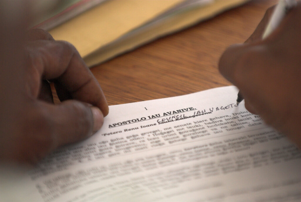 Notes are added to a draft during a checking session of the Koita Ga Bible translation. Papa village, Papua New Guinea.